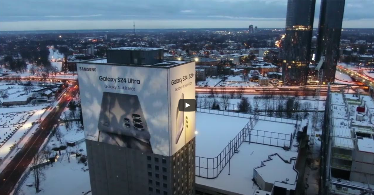 The Preses Nams building facade on Balasta dambis is the largest outdoor advertising space in Riga. The over 1,000 m² advertising banner is highly visible even from a distance. To create an impressive outdoor advertising experience for residents and visitors, Samsung continuously seeks new and innovative ways to maximize the potential of this advertising location.